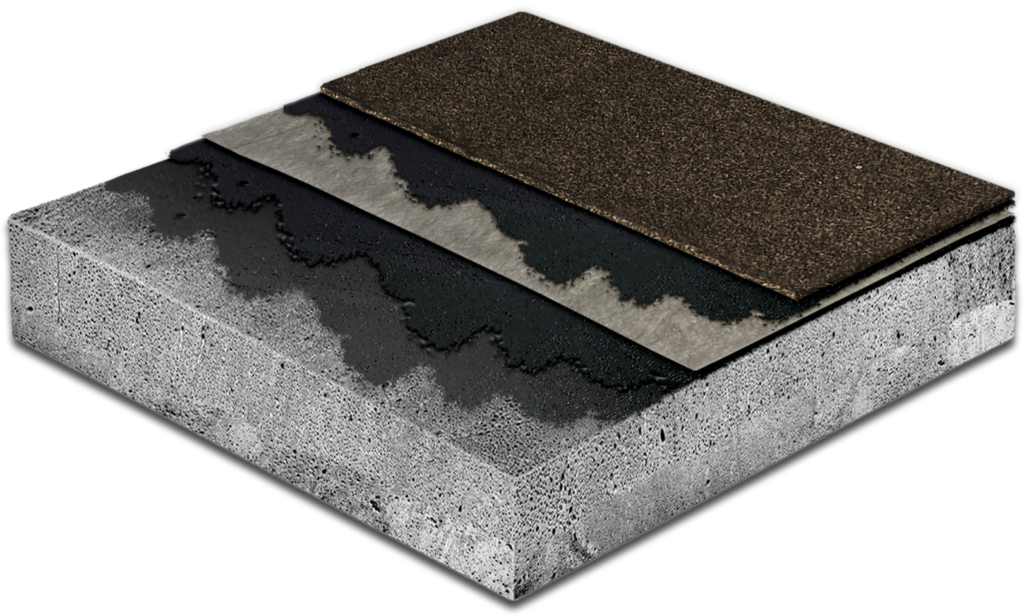 RamTough 250 waterproofing is composed of SBS rubber polymers, specially refined unoxidized asphalt, recycled tires and mineral filler. It is melted on the jobsite, spread on the deck 90 mils thick, reinforced with polyester fabric, over-coated with another 125 mils of RamTough 250 and covered with an SBS reinforced protection course, creating a total membrane thickness of approximately 300 mils. Totally adhered, water cannot get under or through this four course application. With the protection layer in place, the membrane is ready to accept a variety of traffic bearing surfaces, insulation, aggregate ballast or a green roof assembly.