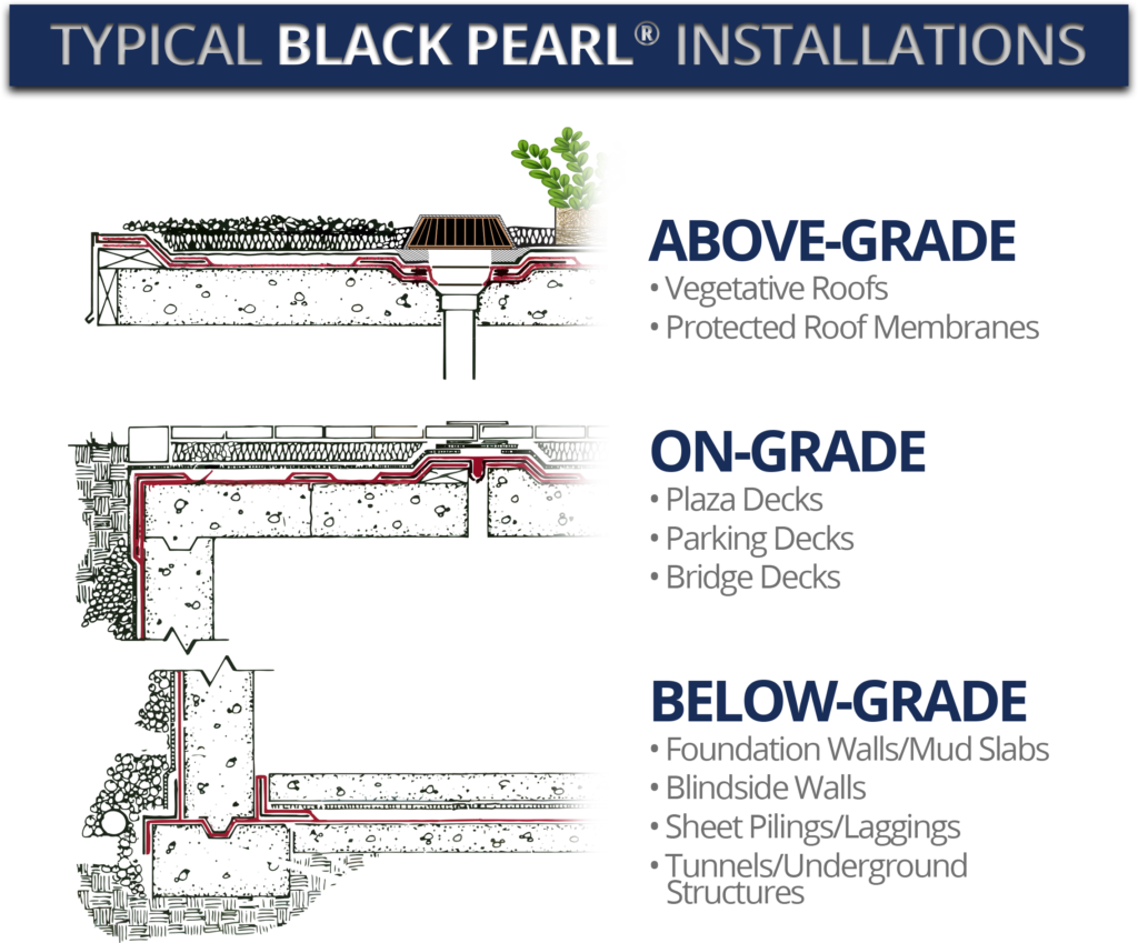 Most Black Pearl® applications are over concrete substrates, however, exterior grade plywood, blindside lagging, sheet piling, cement board and even asphalt protection boards are also acceptable substrates with some waterproofing designs. Consultation and peer reviews are encouraged and welcomed.