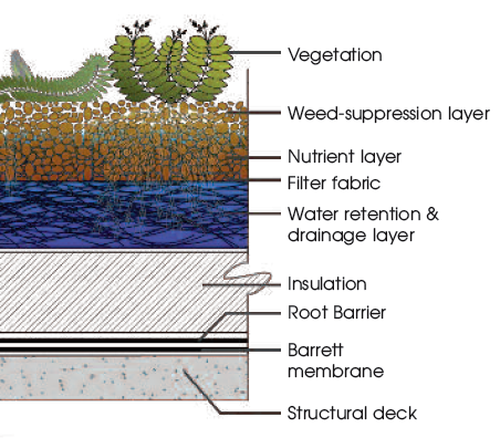 EcoCline® Green Roof is a vegetative roof covering unlike any other. Developed by renowned greenroof landscaper Furbish, Co. and marketed in conjunction with the Barrett Company waterproofing systems, the EcoCline® profile options offer highly efficient stormwater management and guaranteed plant performance in lightweight configurations.
