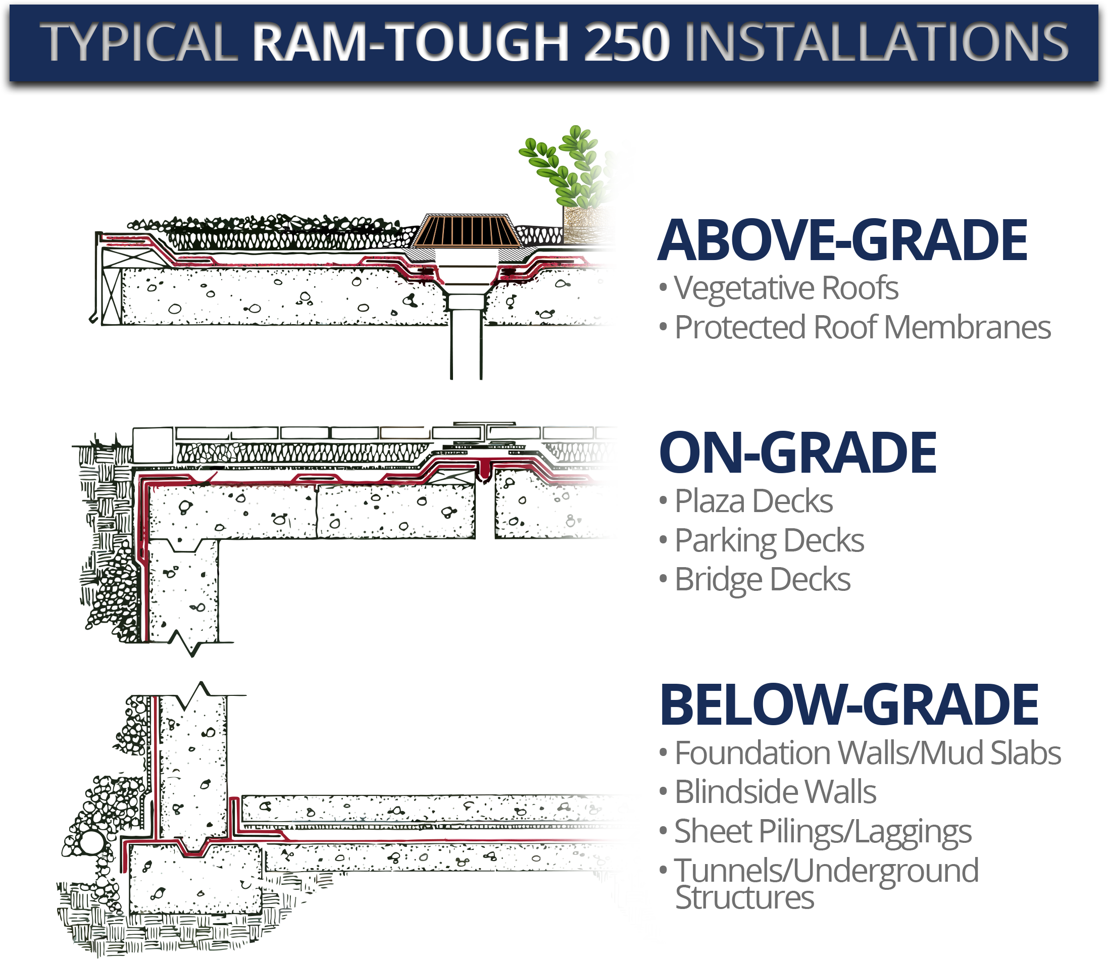A thermoplastic material, RamTough 250 Bitumen is a 100% solid polymer-modified rubberized bitumen which forms a completely monolithic, waterproof barrier without seams or joints.