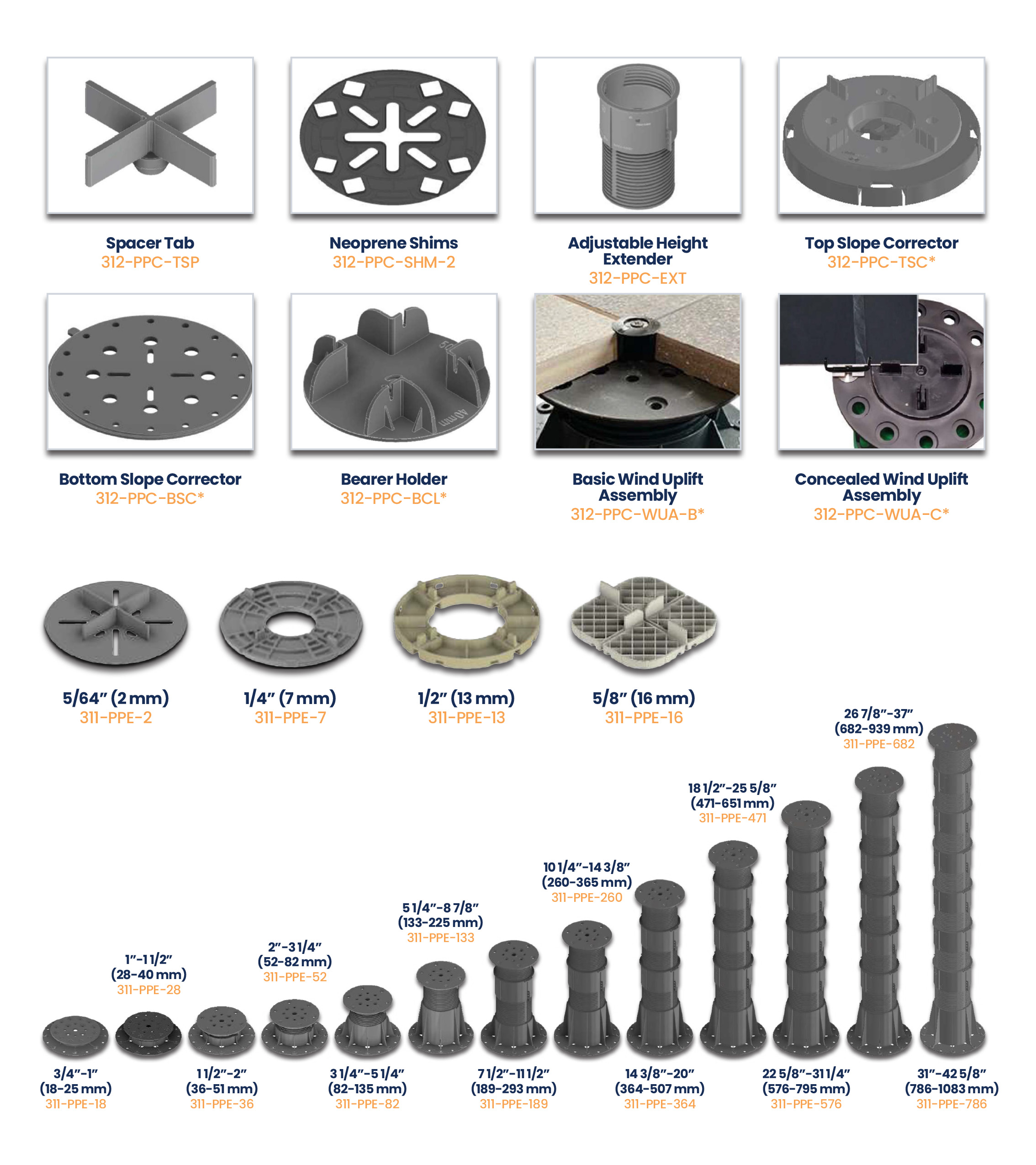 • Has a height range from 5/64” -42 5/8” for use with concrete, wood, porcelain, and stone pavers or tiles