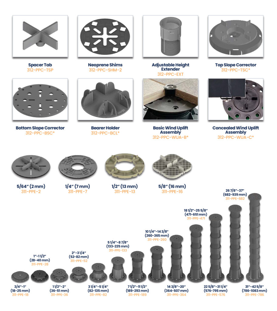 Roofscapes® SpiralJack Pedestal system consists of recycled polypropylene pedestals ranging from 5/64” – 42 5/8” for use with concrete, wood, porcelain, and stone pavers or tiles.