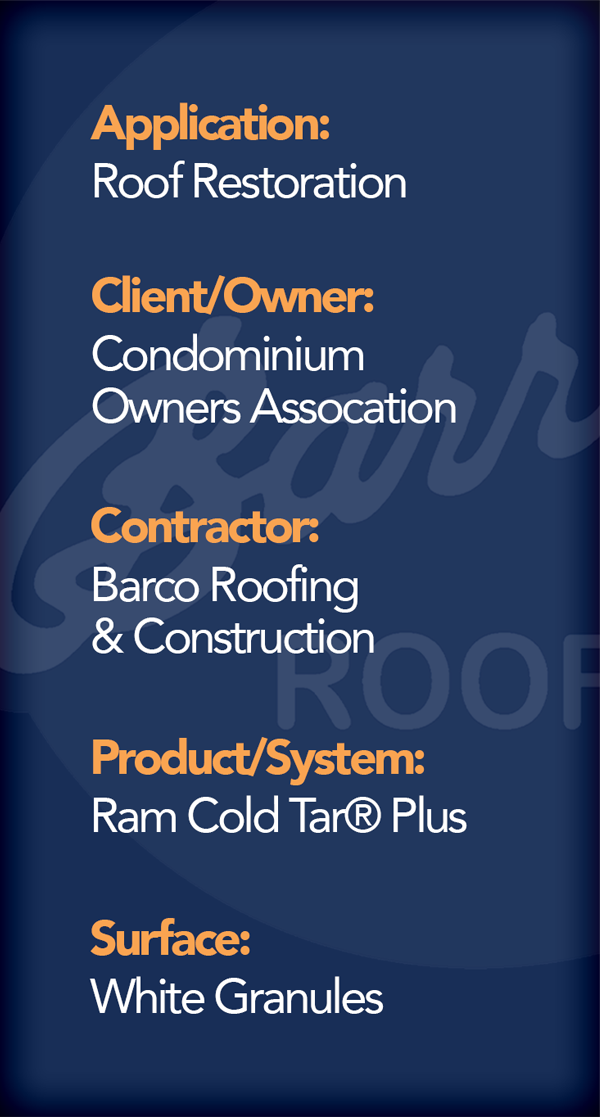 Applied as a heavy liquid, the Ram Cold Tar® Plus polymer-modified system chemically fuses with the existing membrane forming a tough, thick, seamless elastomeric membrane, adding years of service life to the existing roof. Ocean Plaza selected bright white granules as the finished surface, leaving a seamless, highly reflective, energy saving finish. The project was finalized with Barrett furnishing its 10-year roof restoration warranty for the owners.
