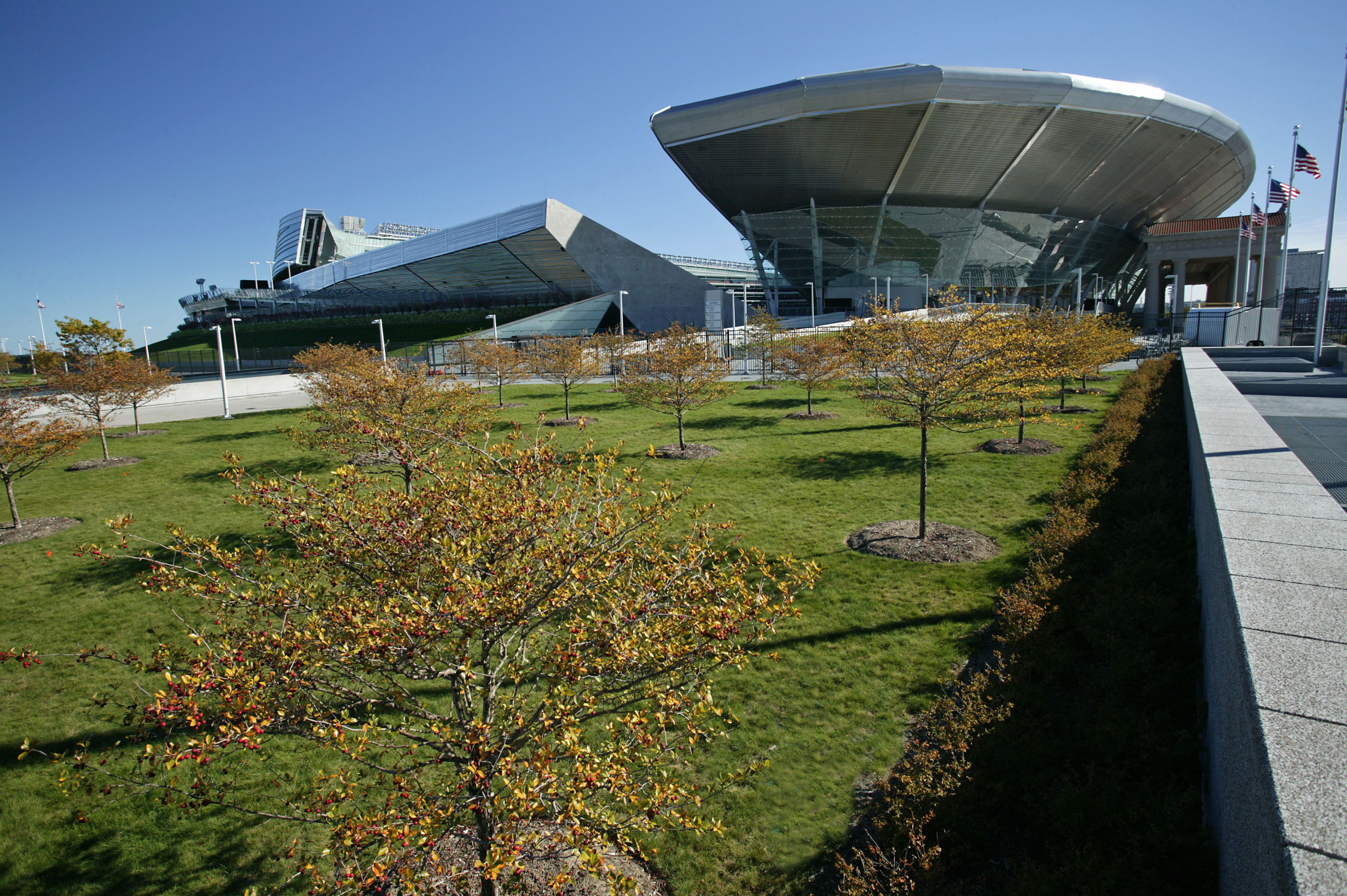 To the west of the main entrance to the parking garage, also on the roof of the parking structure, a hawthorn orchard was planted in a radiating grid that reflects the new stadium geometry. Nine special soil profiles were specifically designed to meet the diverse needs of this demanding site. The use of the site by hundreds of thousands of visitors per year required considerable agronomic innovation to ensure sustainability of the landscape under such physical loading and abuse. Soil system profiles ranged in depth from six-inch sand plates for steeply sloping turf areas, to 30 inches “perched water system” profiles in deepened tree planting areas.