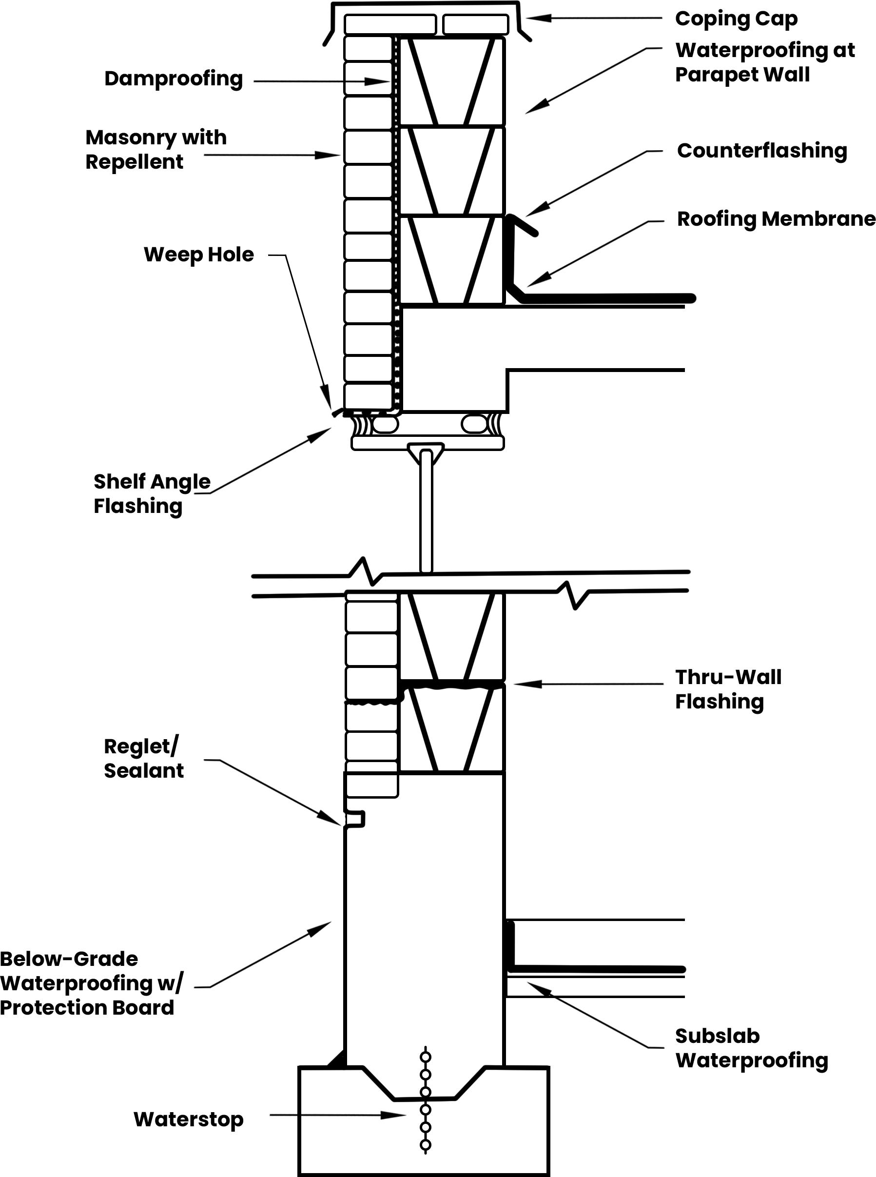 The resulting improper attention to details is responsible for countless problems in construction. Properly detailing a building’s envelope presents an enormous task. From inception to installation, numerous obstacles occur. Highlighting this interrelationship of various envelope systems is the most important principle of waterproofing.